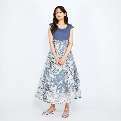 スクエアネックデザインでデコルテをすっきりさせてお顔まわりを涼やかに、またウエストはV字に切替え腰位置を高めに設定しスタイルアップが叶います。
