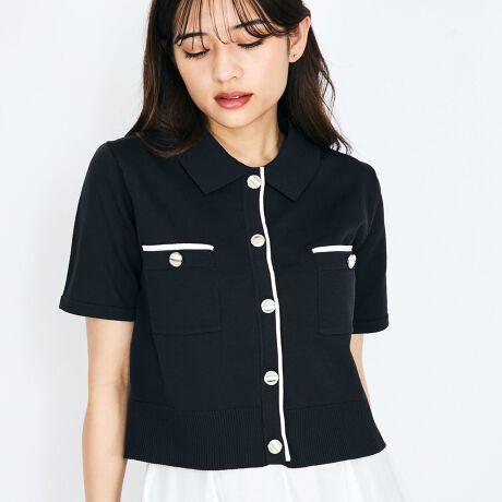 配色ラインのポロ襟ニットカーディガントップスです。