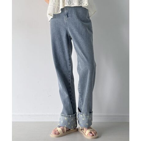 花柄刺繍ロールアップデニムパンツ