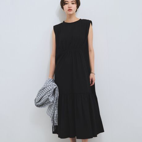ワンタックショルダーのノースリーブデザインで、フロントウエスト部分にゴムギャザーを寄せ、陰影のウエストマークでボディラインに引き締め感を与えます。