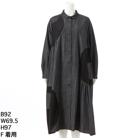 カジュアルなデニム素材に、丸型の異素材パッチワークを施した、遊び心のあるワンピース。