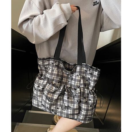 肩にかけやすい持ち手の長さで、A4サイズもすっぽり入る容量。中心部分にはくしゅっとしたギャザーを加え、実用性だけでなく見た目にも可愛いアイテム。全体にプリントされた総柄デザインがスタイリングのアクセントになります。