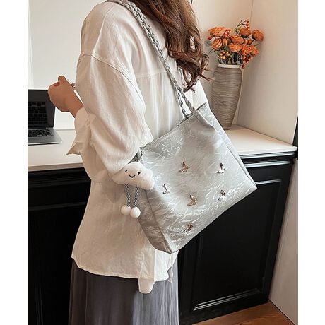 蝶のメタルモチーフが立体的に配置されたボディがポイントのトートバッグ。ナチュラルな雰囲気と遊び心のあるデザインが魅力です。
