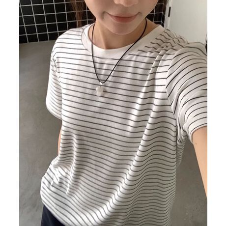 細かめのボーダーが程よくカジュアルで、クルーネックにより顔まわりはすっきり見える仕上がり。ドロップショルダー気味のデザインでリラックス感があり、体型カバーにも◎。やや長めの着丈で、メンズライクにもフェミニンにも着こなせる万能感が魅力です。