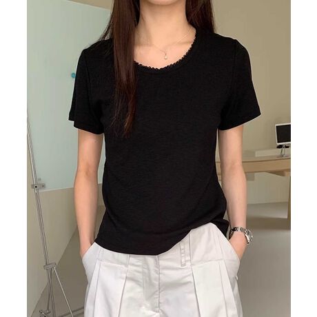 シンプルな中にこなれ感をプラスした、フリンジネックデザインのTシャツ。やや広めに開いたネックラインで、顔まわりをすっきり見せつつ女性らしさもUPしてくれる一枚です。