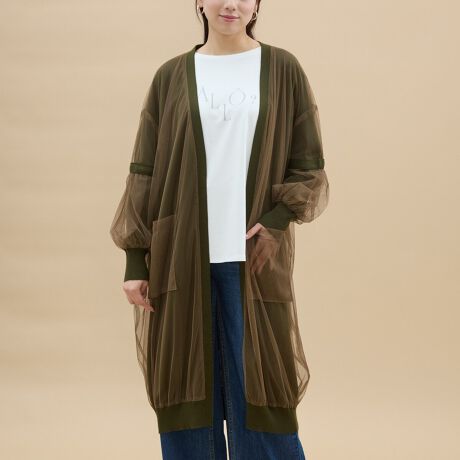 ふわりと軽やかなチュールと、柔らかなニットを重ねた、とっておきのロングカーディガン。