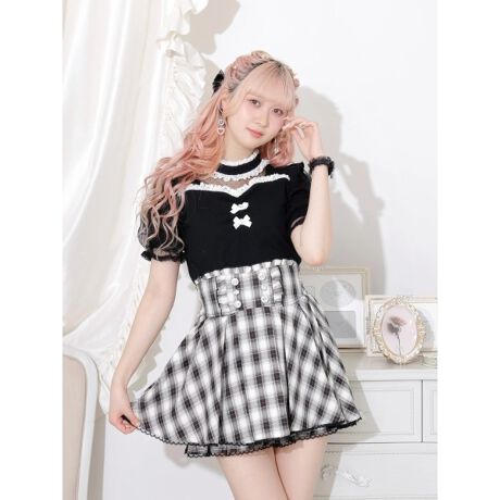 レースフリルとパールビーズの縁取りや胸元のダブルリボンも愛らしいアクセントをプラスしてくれます。