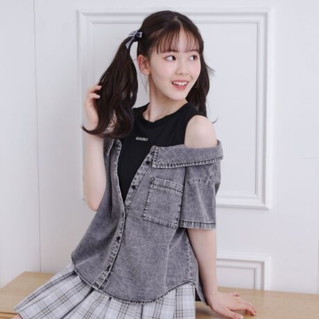 肩あきデニムドッキングシャツ