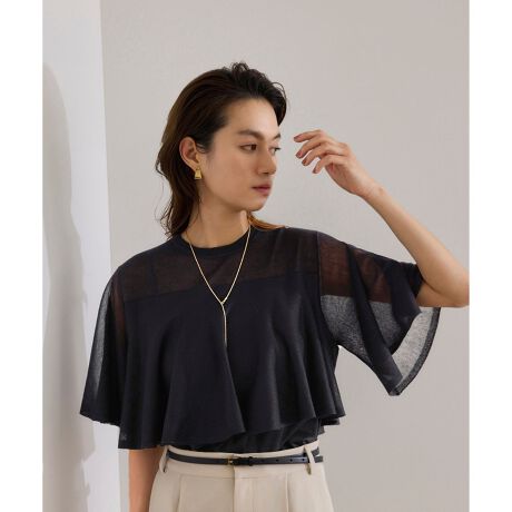 ティアードのディテールが華やかなプルオーバー。フレアースリーブになっているので手を上げやすく、夏の暑い時期にも肌離れが良く快適に過ごせるトップスです。トップスの裾をタックインすることでケープを纏ったように見え、さらにフェミニンな印象に。