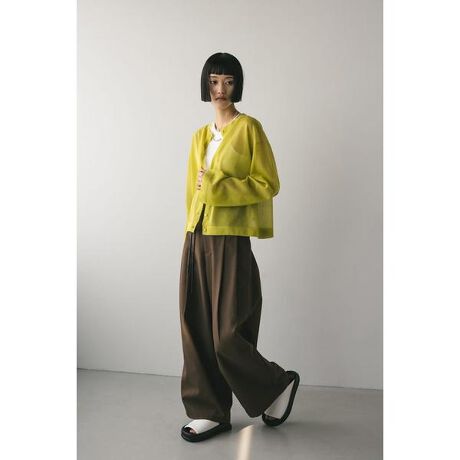 WHT:モデル身長165cm(FREEサイズ着用)BLK,LIME:モデル身長166cm(FREEサイズ着用)ドライタッチで程よいハリ感にこだわりぬいたリネン混のニットカーディガン。ルーズなサイズ感で抜け感もあり。コーディネートに使いやすい一枚です。透け感あり、ストレッチややあり。【お手入れ方法】マシンウォッシュ可
