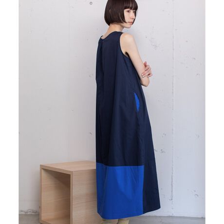 脇に丸みを出したコクーンシルエットと、バックヘムの配色切り替えが印象的なワンピース。ポケット口を丸くカッティングして配色がちらりと見えるようにしています。薄着になる季節に一枚で着映えして、暑い夏に重宝する袖なしのワンピース。シャツやカーディガンも羽織りやすいです。両サイドポケット付き。