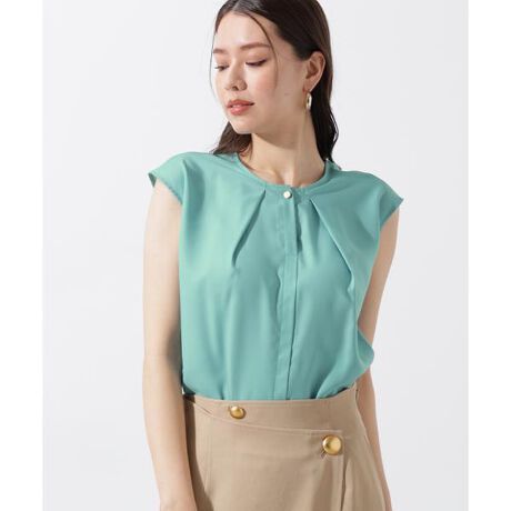 フレンチスリーブブラウスはきゅっと詰まったネックラインに施したタックでふんわりとしたボリュームを持たせ、女性らしい柔らかな雰囲気に仕上げました。首元のメタル釦もさりげないポイントです。