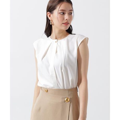 フレンチスリーブブラウスはきゅっと詰まったネックラインに施したタックでふんわりとしたボリュームを持たせ、女性らしい柔らかな雰囲気に仕上げました。首元のメタル釦もさりげないポイントです。