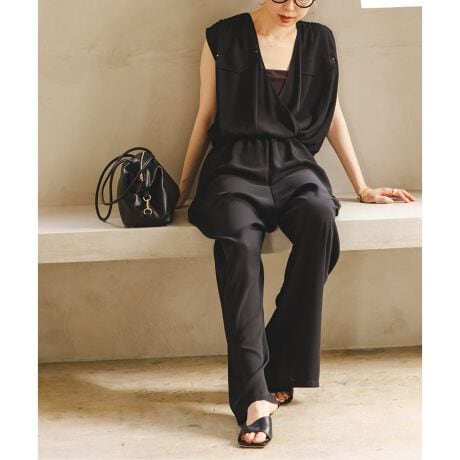 とろみのある女性らしい素材をフロントポケットなどミリタリー調のデザインに落とし込んだことで、甘すぎず辛すぎないバランスの取れた1着に。
