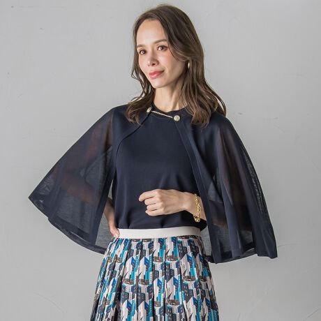 シアー感が上品なケープとノースリーブトップスのアンサンブル。