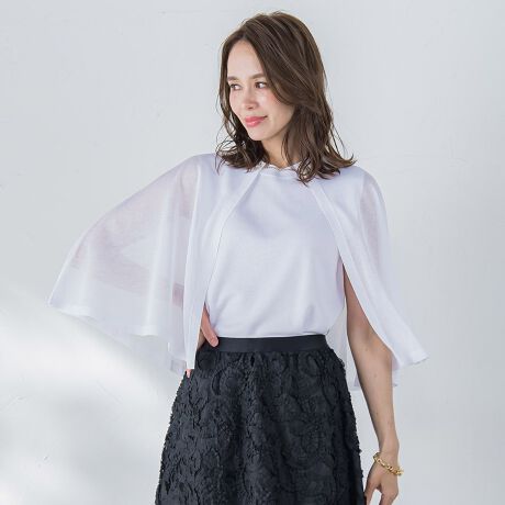 シアー感が上品なケープとノースリーブトップスのアンサンブル。