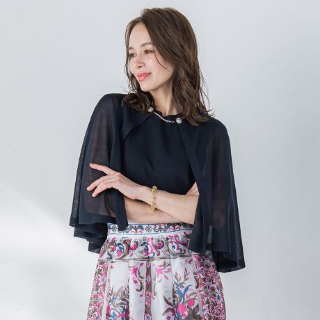 シアー感が上品なケープとノースリーブトップスのアンサンブル。