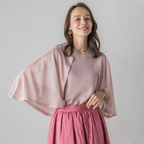 シアー感が上品なケープとノースリーブトップスのアンサンブル。