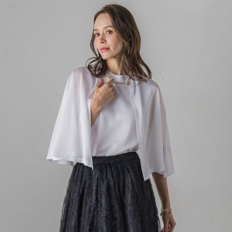 シアー感が上品なケープとノースリーブトップスのアンサンブル。