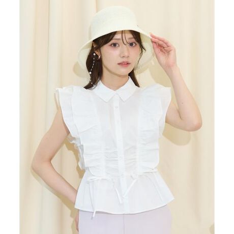 ボリューム感を演出するフリル×ギャザーが大人可愛い、最旬フェミニントップス【Design】・華やかさと今っぽさを両立したギャザーリボンフリルスリーブブラウス。・トレンド感たっぷりのペプラムシルエットで、ウエストまわりを自然にカバーしつつスタイルアップを演出♪・フェミニンな印象を引き立てるノースリーブデザインで、1枚で着映えする主役級トップスに。・フロントボタン仕様なので、きちんと感もありオフィスカジュアルにも◎【Fabic】・軽くて薄いさらりした生地を使用。・ホワイト、ミント、ギンガムの3色展開となります。・ご自宅でお手入れが出来るのも嬉しいポイント♪【Care】洗濯機洗い可能