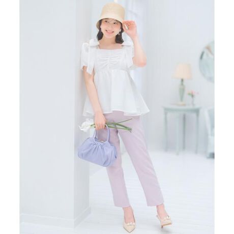 サイドに施したパールが上品なアクセントになり、女性らしい華やかさを演出するテーパードパンツ【Design】・きれいめな印象を与えながら、デイリーにもオフィスにも使えるテーパードパンツ。・Tシャツからブラウスまで、どんなトップスとも好相性な万能アイテムです。・裾に入れたスリットが、抜け感のある今年らしい着こなしを叶えます♪・フロントはボタン&フック仕様で、ウエストまわりをスッキリ見せてくれます。・ウエストバックはゴム仕様で、きちんと感と快適な穿き心地を両立◎・実用的なサイドポケット付きで、後ろはフェイクポケットでシルエットも美しくキープ。・オンオフ問わず活躍する、一本は持っておきたいテーパードパンツです。【Fabric】・上質感のあるさらりとした生地を使用。・ご自宅でお手入れが出来るのも嬉しいポイント♪・ホワイト、ピンク、ブラックの3色展開となります。【Care】洗濯機洗い可能