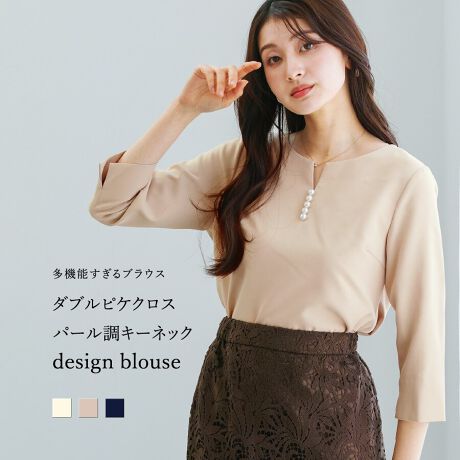 ダブルピケクロス・パール調キーネックデザインブラウス