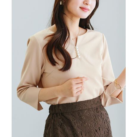 ダブルピケクロス・パール調キーネックデザインブラウス
