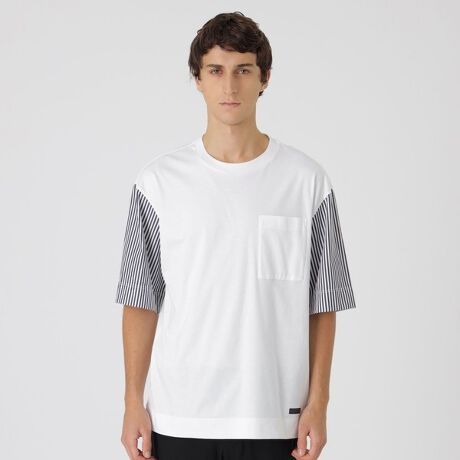 袖にロンドンストライプ柄をあしらった、ややオーバーサイズフィットのTシャツ。ジャージー素材のボディに袖のストライプはシャツ地を使用したドッキングデザインが特徴です。一枚でもスタイリング映えするTシャツです。