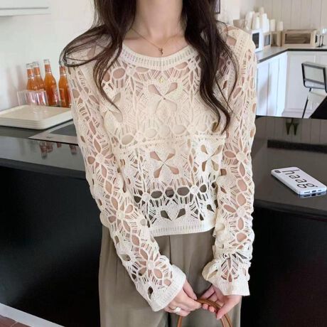 クロシェ編み模様が美しく、ナチュラルな雰囲気が魅力のトップス。<br>
