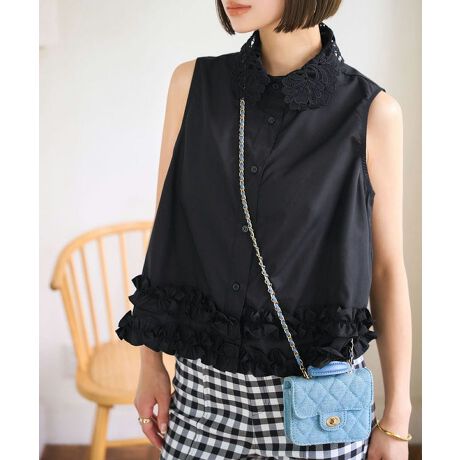 襟には繊細なレースをあしらい、裾はギャザーフリルで立体的な華やかさをプラスしたヘムデザイン。