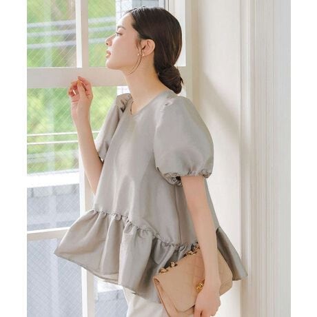 高級感あるシャイニー素材が目を惹く、おとなのペプラムブラウスが新登場。