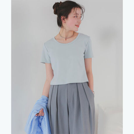 【汗染み防止加工シリーズ】・クロップド丈のコンパクトなデザインがデイリー使いしやすい半袖Tシャツ・ベーシックで使いやすいカラー展開に加え、差し色やボーダーの華やぐカラーもご用意・女性らしい、きれいなデコルテ見せにこだわった広めの襟ぐりがポイント◎・ボトムス選ばず、幅広いコーディネートで活躍してくれる1枚[型番:AFXT0327]