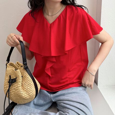 ・ふんわりとしたラッフルが顔周りを華やかに彩るカットソーブラウスです