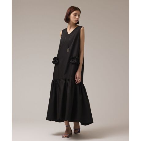 【Japan Fabric】さらっと着るだけでフェミニン&モードに決まる、主役級サマードレス。ロング丈のゆったりとしたリラクシーなシルエットに、サイドに構築的なフリルを飾った可憐なディティールをポイントに効かせた一枚。シャープなVネックに仕上げる事で甘くなりすぎず、すっきりとした大人な印象で着て頂けるデザインに仕上げました。腰下から細かなギャザーをたっぷり入れたフレアシルエットが、上品な揺らぎと贅沢なボリューム感を生み出します。着心地は楽でありながらも洗練された印象で着て頂ける着映えワンピースです。