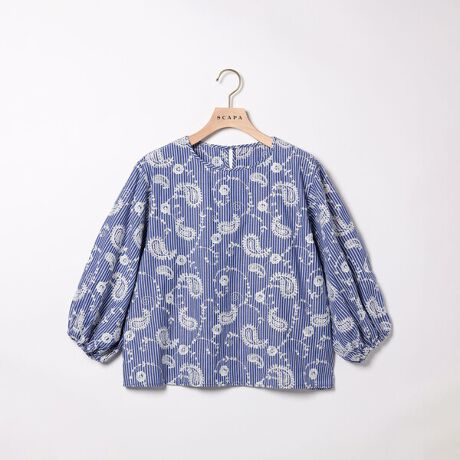 清涼感のあるコットン生地を使用し、ストライプ柄×ペイズリー刺繍をあしらったプルオーバーブラウス。爽やかでエレガント、そしてエスニックな雰囲気が漂う一着です。シルエットはややコンパクトな作りで、ふんわりした袖が可愛らしいアクセント。無地のボトムを合わせるだけでお洒落にまとまり、スタイリングも簡単です。
