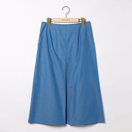 大人の気品とカジュアルさを併せ持ったライトダンガリー生地のスカート。さらりとした質感や微光沢感、セミフレアシルエットやボックスプリーツなどがポイントです。快適なバックゴム仕様のウエスト、便利なサイドポケットも魅力。無地はもちろん柄物のトップスとも相性がよく、様々なコーディネートに活躍します。