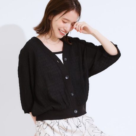 表情ある素材を使用したVネックで、サッと羽織るだけで体型カバーしながらサマ見えします。