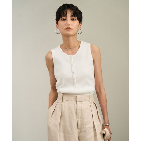 夏の定番にぴったりな、上品な抜け感を演出するリブヘンリーネックノースリーブプルオーバー。