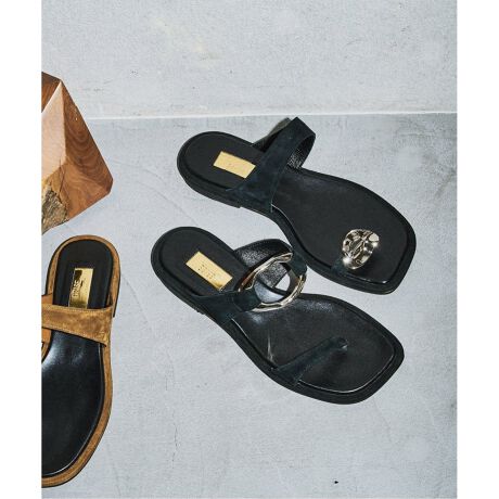 本革スエードを使用した左右アシンメトリーなトングサンダル。