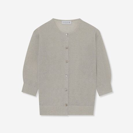 清涼感を感じるシアーな編地と、ハリのあるドライタッチな素材感が暑い時期に最適な着心地のハーフスリーブのカーディガンです。コンパクトな丈が視線を上に集め、スタイルアップを叶えてくれる一枚です。袖ぐりと袖幅を広めにしインナーがもたつくことなく着用いただけます。