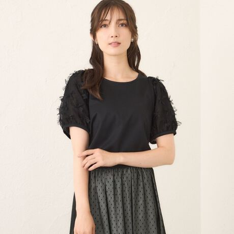袖部分にリボンモチーフをあしらい、さりげない可愛らしさを添えたデザインが魅力の異素材切り替えで魅せるエレガントプルオーバーです。