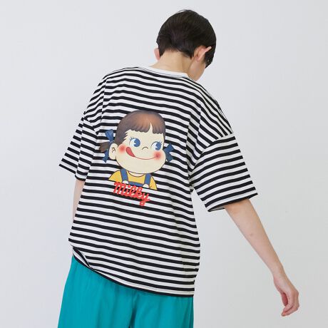 ミルキー(milky)は、株式会社不二家が1951年(昭和26年)から発売しているキャンディ、およびその関連商品のブランド名である。ペコちゃんは、1950年に不二家洋菓子店の店頭人形としてデビューし、1951年ミルキー発売時にパッケージに登場しました。舌をペロッと出したその姿は愛くるしさ満点です。そんなペコちゃんのイラストを使い、リラックスした世界観を出したデザインと形でスペシャルなコラボレーションが実現。【素材】適度な厚みとハリ、綿の持つ肌触りの良さがポイントの天竺素材を使い、ドット柄の生地プリントを施しました。C/#03ボーダーは、先染めのボーダー天竺素材を使用しました。【デザイン】ゆったりとしたボディーのTシャツの左胸には、実寸サイズのミルキーのキャンディーのプリントが入っています。背中には、ミルキーペコちゃんのプリントが大胆に入っているのがポイントになっています。*こちらの商品はユニセックス商品です。【ブランド情報】FRAPBOIS/フラボア2001年にブランドスタート。「大人げない大人の服」をコンセプトに、大人が着るリラックスしたデイリーウェアを提案するコレクションブランド。レディースとメンズのアイテムをご用意しています。FRAPBOIS official website