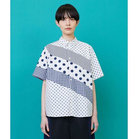 【素材】肌触りの良い綿のブロード素材は2種類のドット柄とストライプ、チェックを贅沢に使用しています。サラッとしながらも適度なハリがポイントです。【デザイン】ベーシックなシャツブラウスをベースに斜めに切り替えを入れてそこに異なった柄の生地を組み合わせたデザインブラウス。大胆な組み合わせながら、色のトーンをまとめる事で一体感を出し着やすいアイテムに仕上げています。*こちらの商品はユニセックス商品です。【ブランド情報】FRAPBOIS/フラボア2001年にブランドスタート。「大人げない大人の服」をコンセプトに、大人が着るリラックスしたデイリーウェアを提案するコレクションブランド。レディースとメンズのアイテムをご用意しています。FRAPBOIS official website