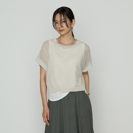 ニットトップはハイゲージで編んだシンプルなバイアス柄の透かし編みになります。