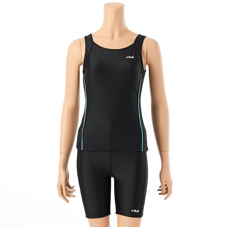 [型番:313282]シンプルなセパレーツ水着。脇に3mmのカラーラインが入っています。肩紐がずれ落ちにくい設計にしています。胸にFILAのロゴプリント。胸裏部分は挿入式のカップが付いていて、お好きなカップに入れ替えも可能です。パンツ前部分全体にも胸部分と同じ伸びの良い裏地をつけています。トップスがめくれ上がりにくい仕様です。ウエストは内側の紐で調節できます。