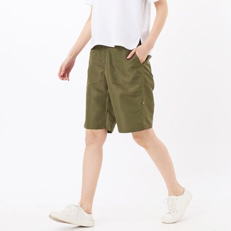 ポリエステルリップストップという強度の高い糸が織り込まれていて、ほつれにくい、破れにくい、避けても途中で止まる特徴がある生地を使用。前ファスナーあきで、ウエストはバックゴム仕様になっているので、着脱も楽で、動きやすく、アウトドアやスポーツにピッタリ。裾をロールアップして丈調節が可能。深めのポケットには、水に入っても大丈夫な水抜き穴がついています。どの色もコーディネートし易いベーシックな色展開。スイムレギンスと合わせて、水に入っても大丈夫。