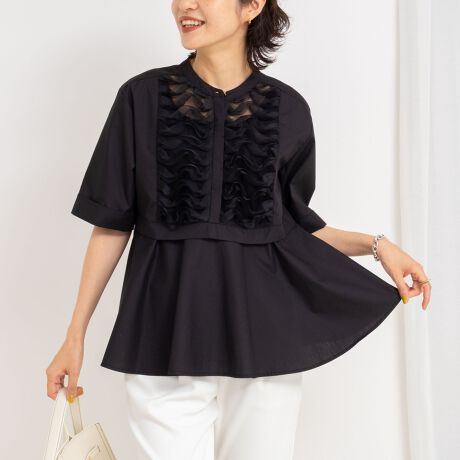 ・フロントのチュールフリルがポイントのペプラムブラウス
