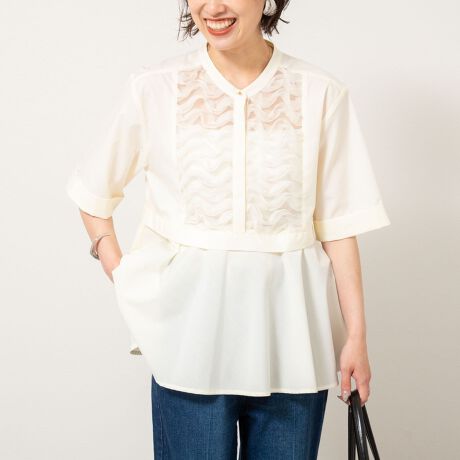 ・フロントのチュールフリルがポイントのペプラムブラウス