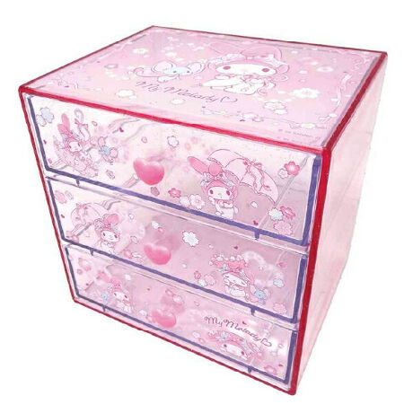 クリアカラー素材にラメが入っているのでキラキラしていてとてもカワイイ3段チェストです。持ち手はハート型でキュート♪全面クリア素材だから中身が見えて使いやすいのもポイント♪こちらはマイメロちゃんデザインです。