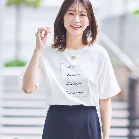 パンツスタイルにはもちろん、スカートスタイリングでアウトにしても決まる丈感とカーブテールでおつくりした大人っぽいプリントTシャツ。